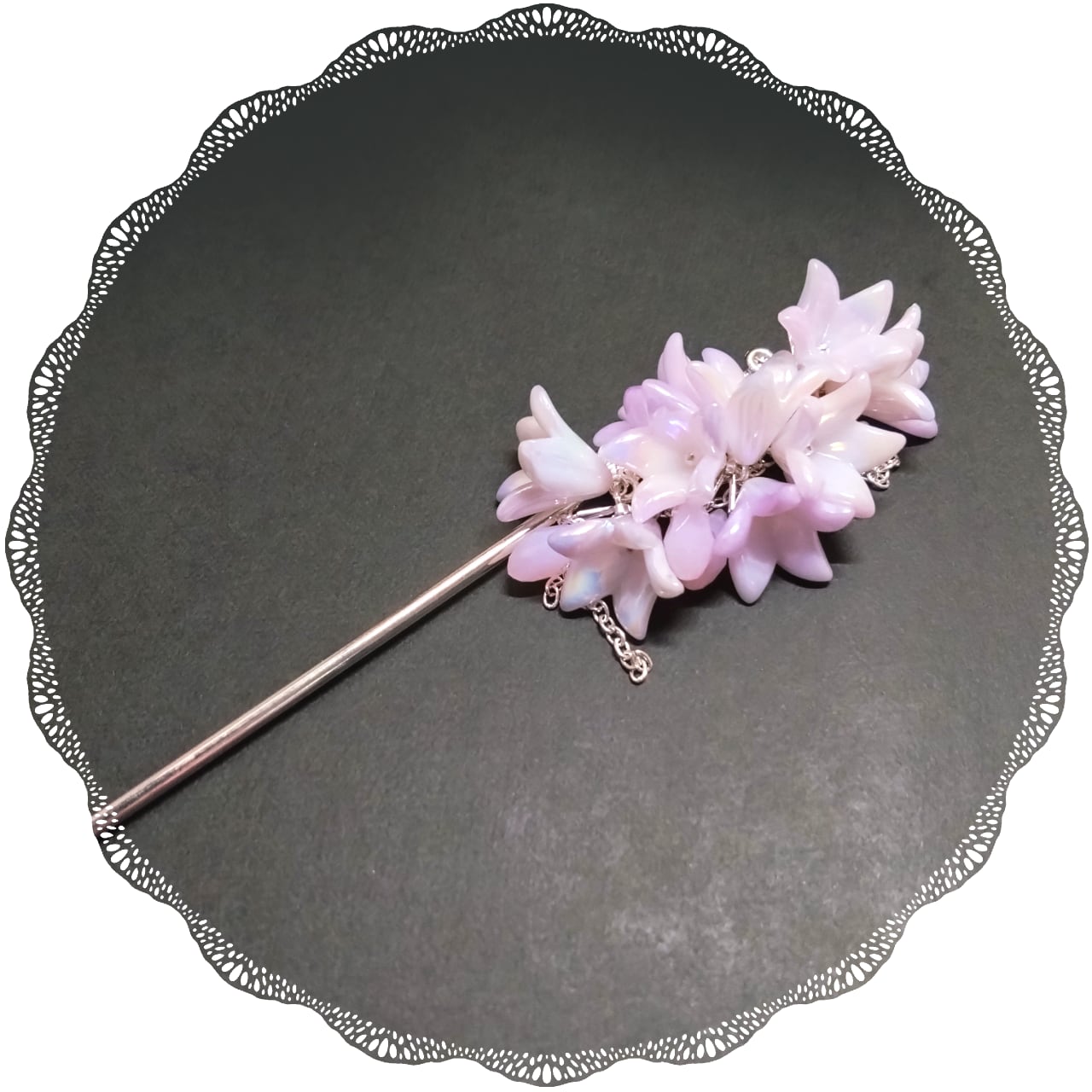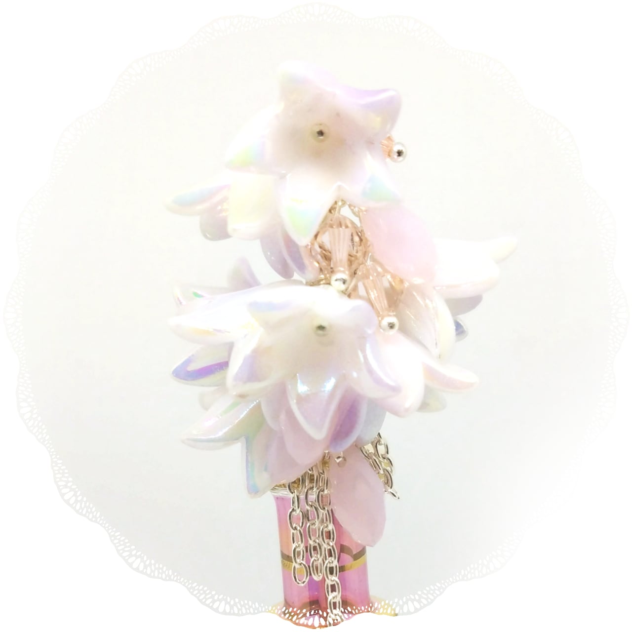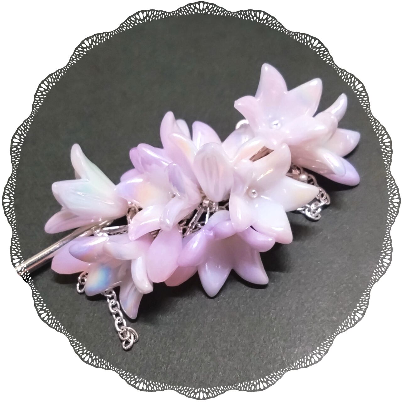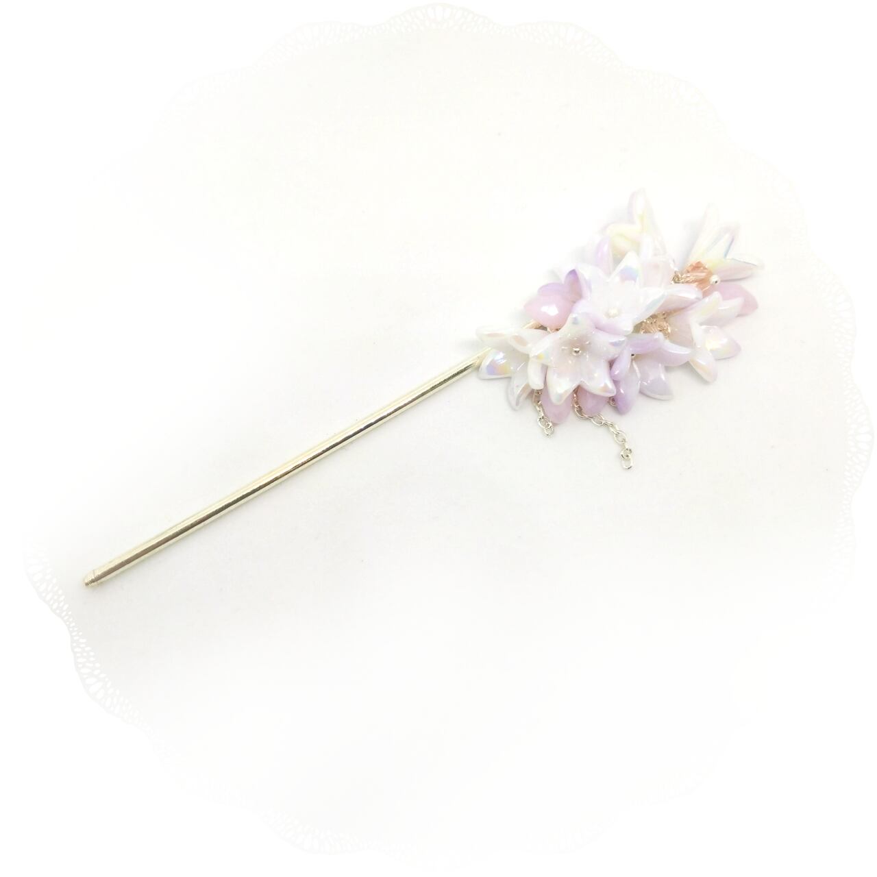 オーロラカラーが入った白い花をたくさん飾ったかんざし