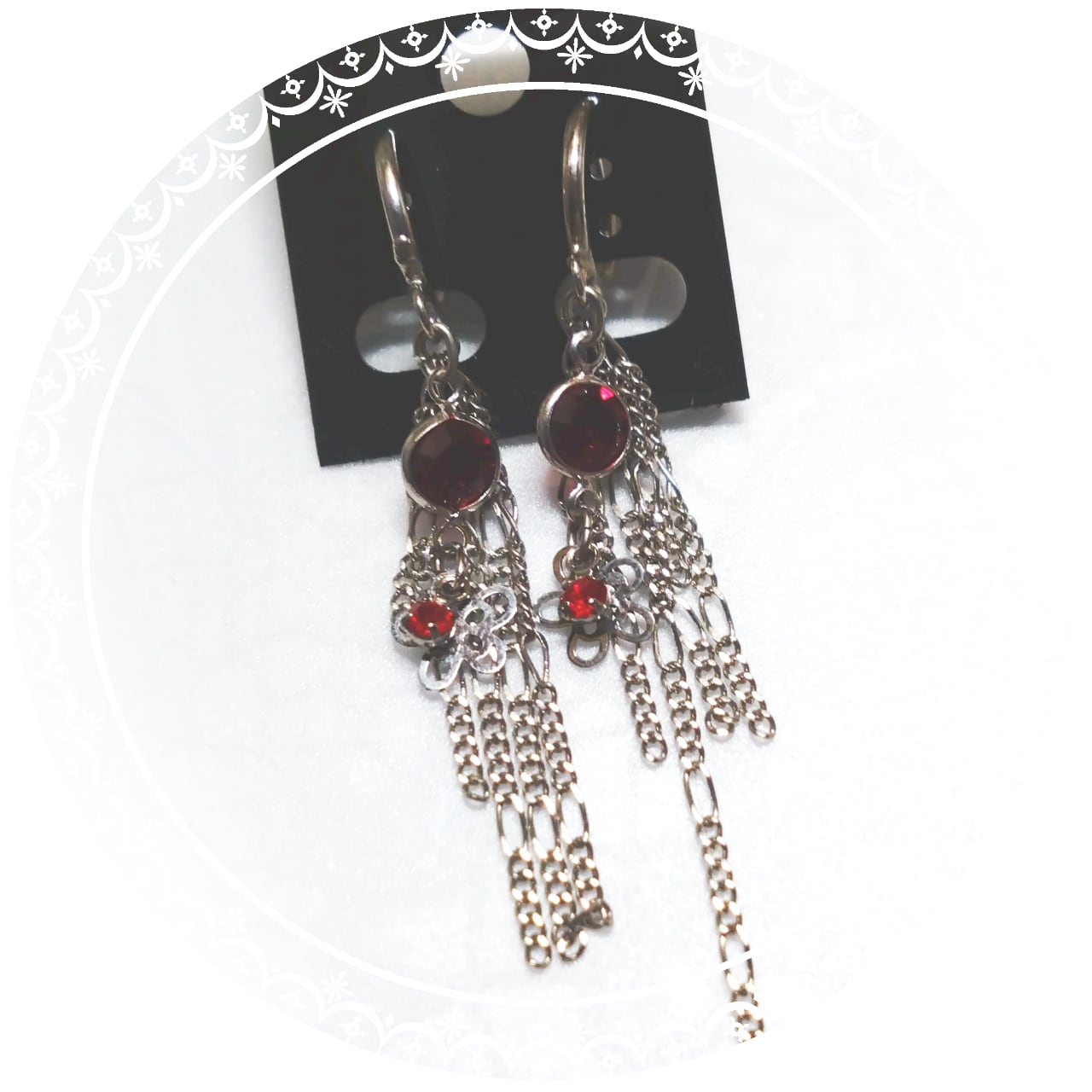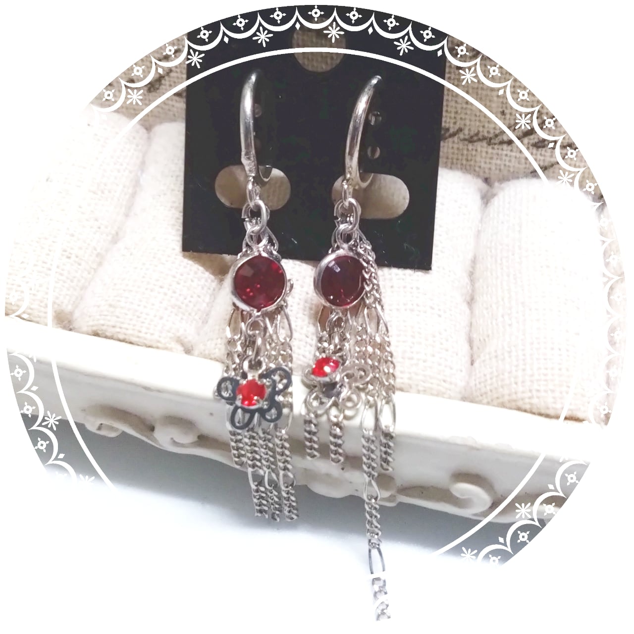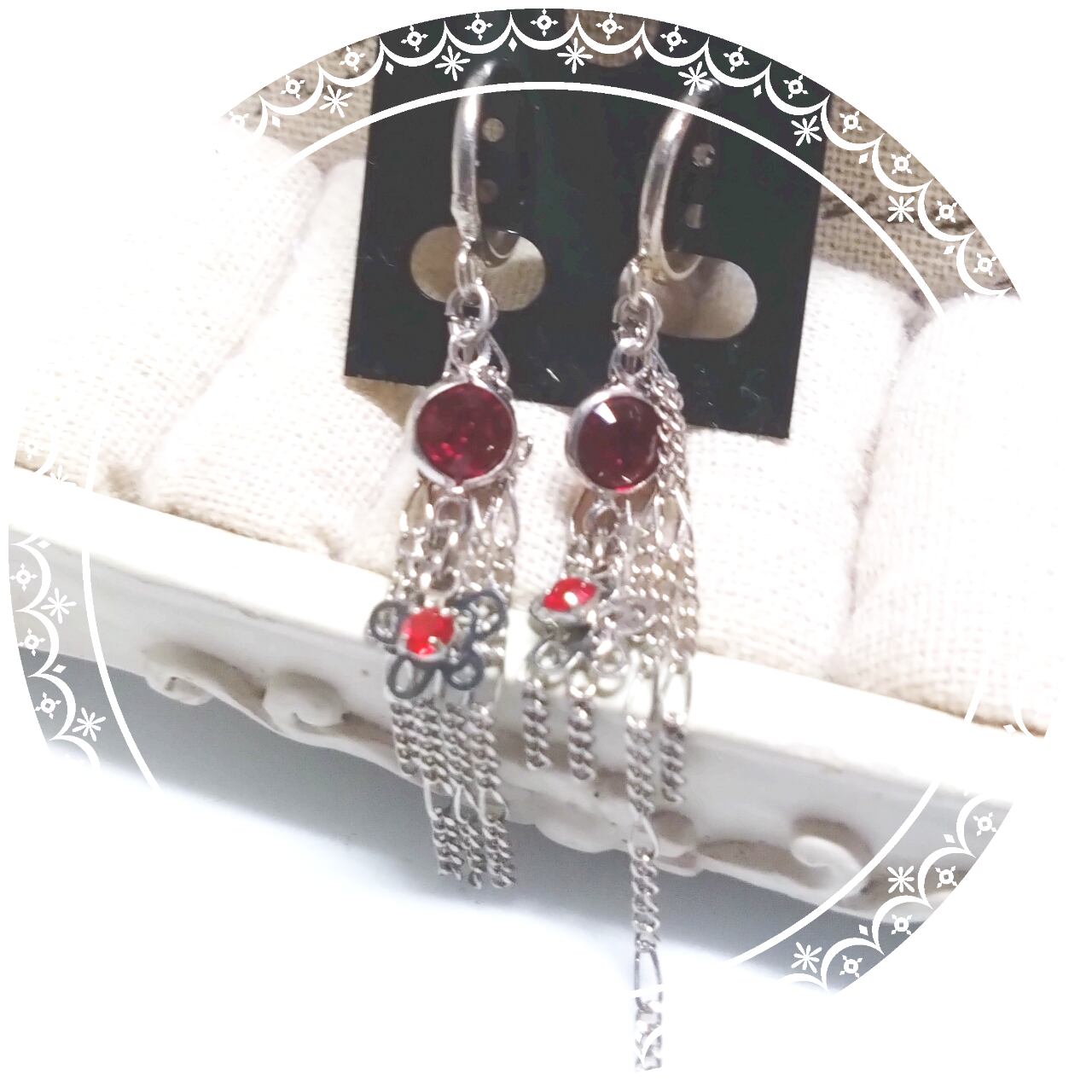 鮮やかな紅赤のストーンにチェーンをあわせたイヤリング
