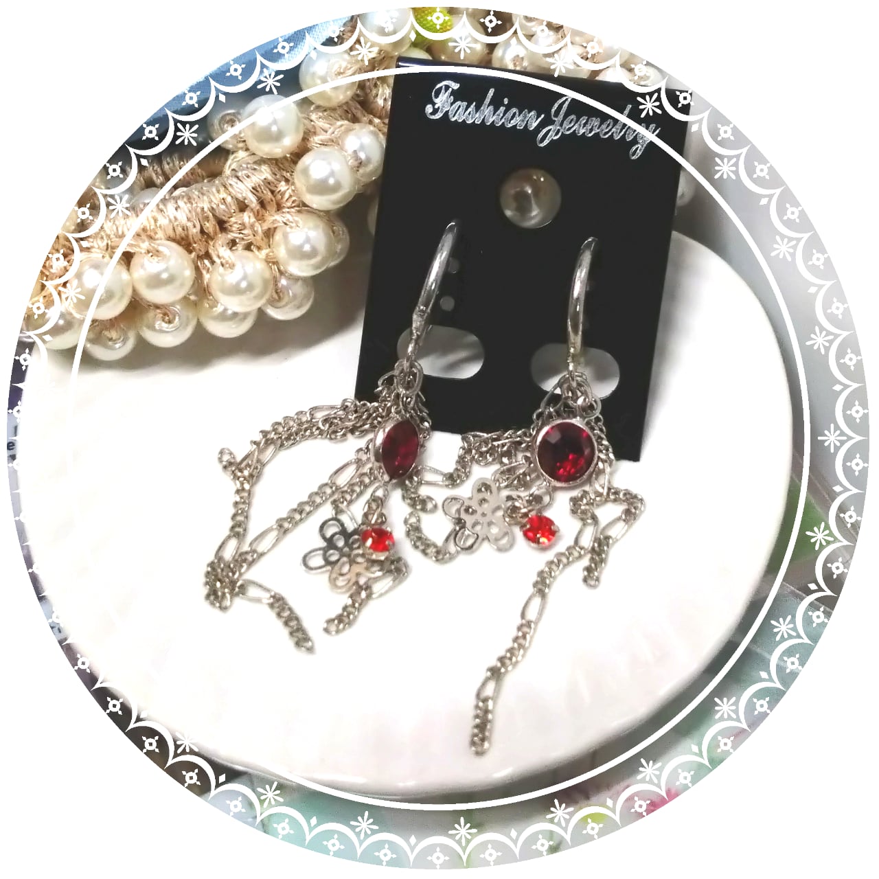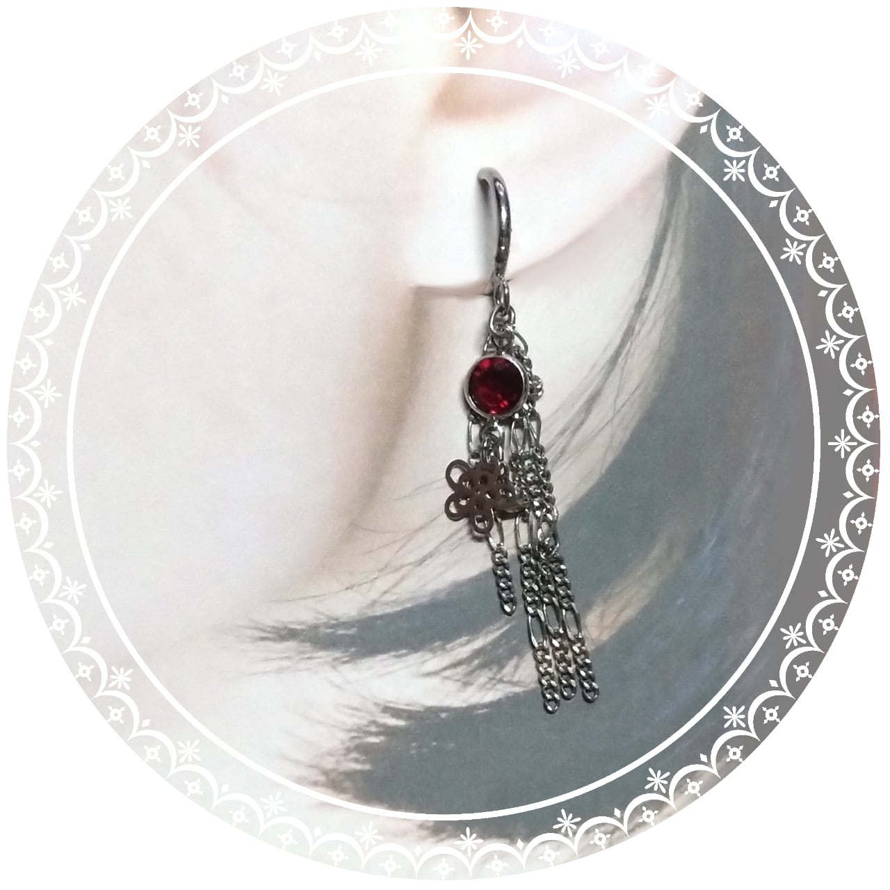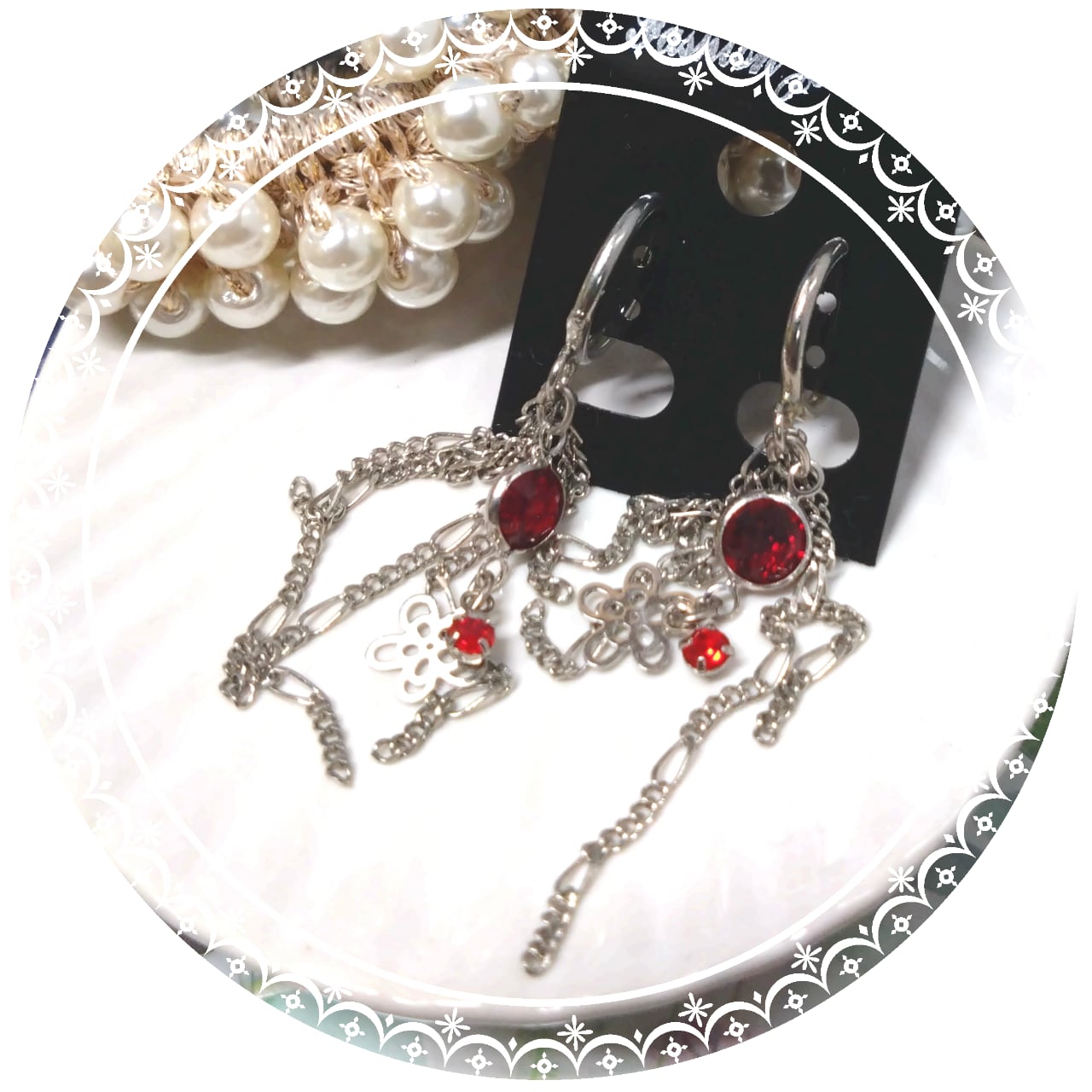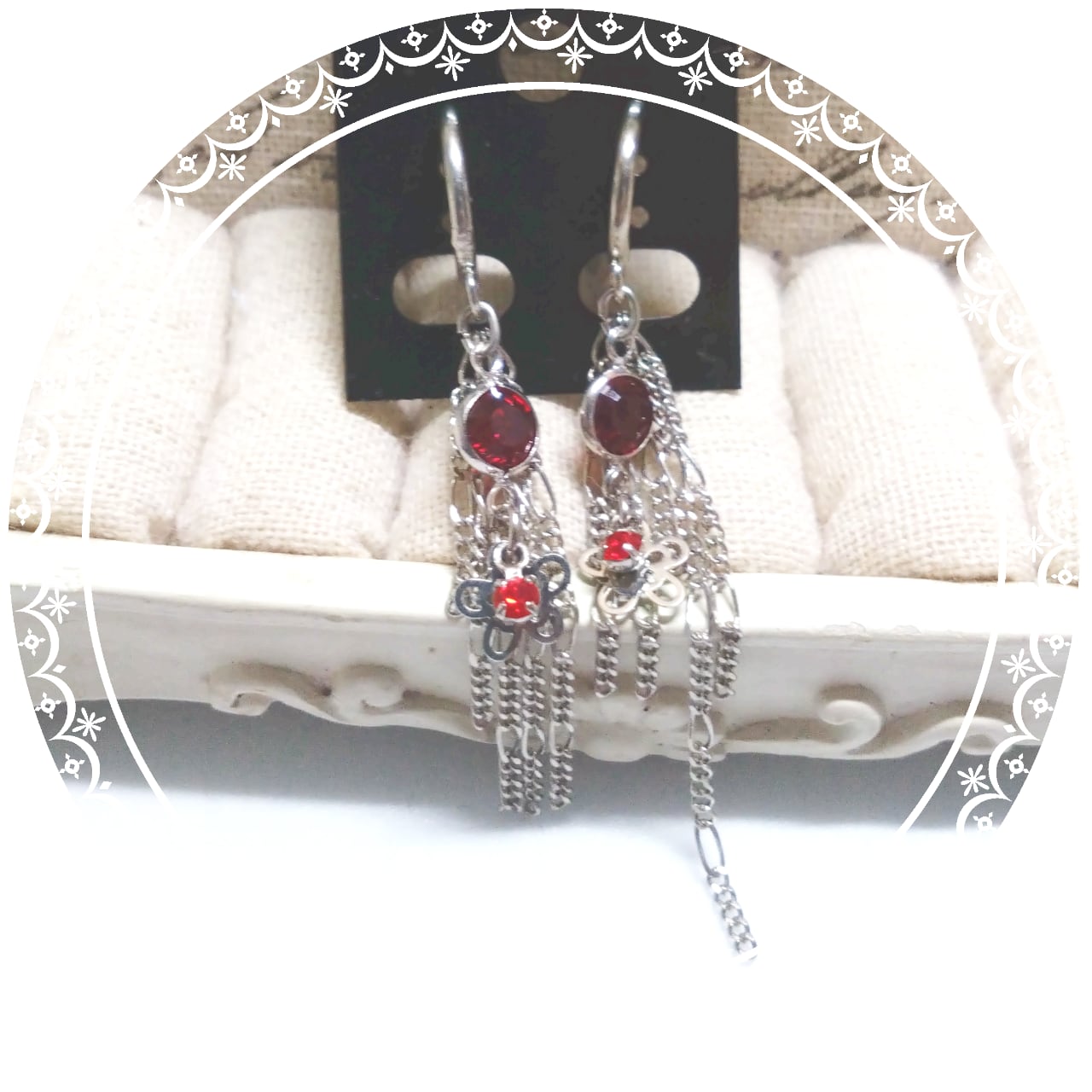 鮮やかな紅赤のストーンにチェーンをあわせたイヤリング
