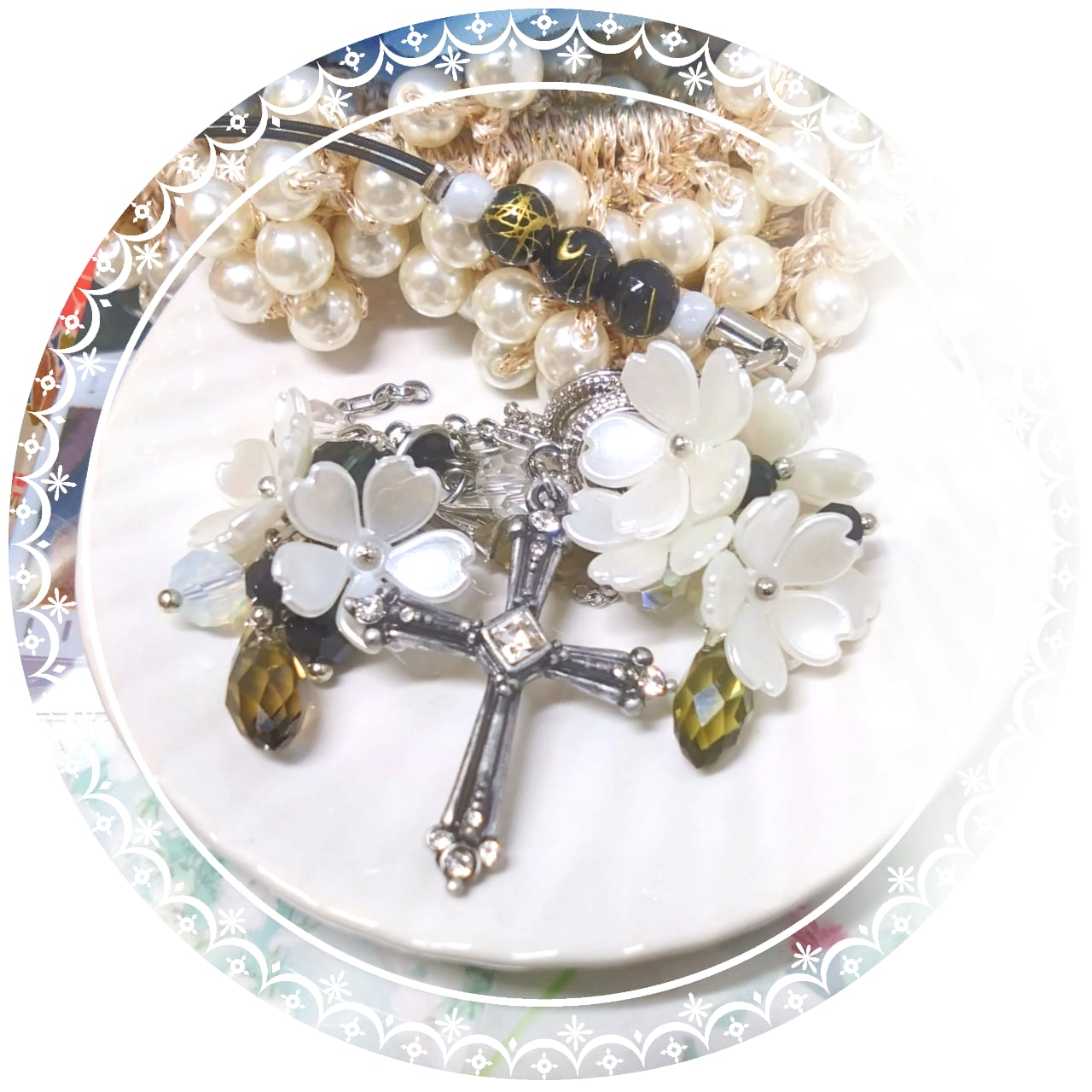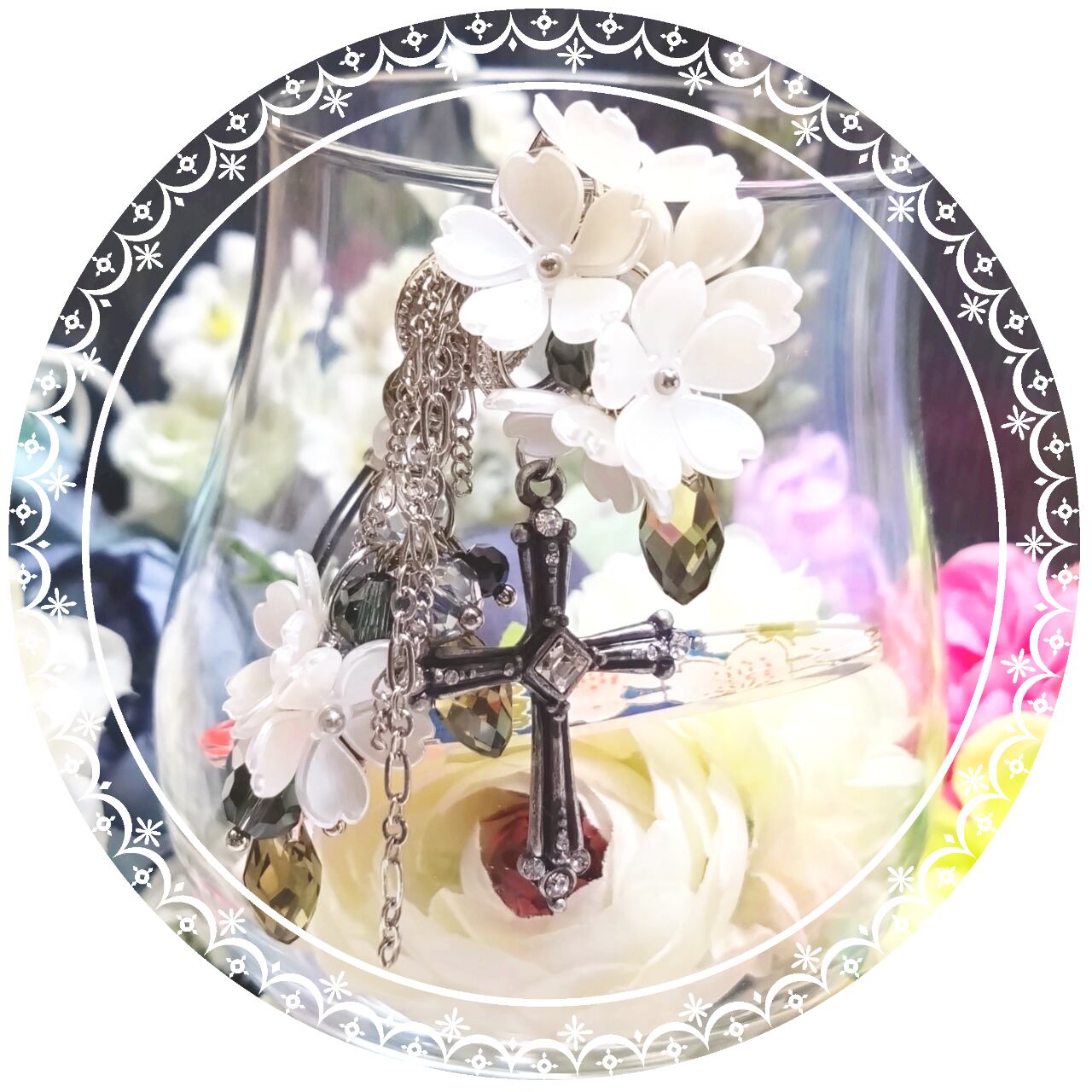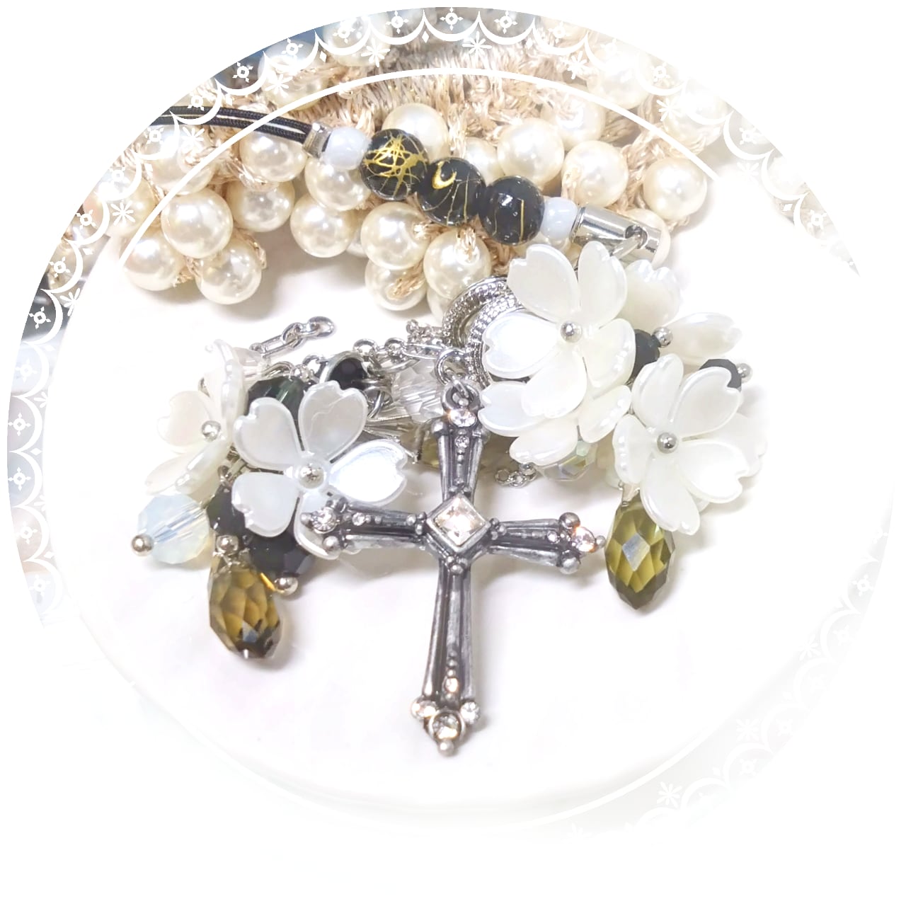 月白色の桜を重ねグレージュカラーのガラスビーズを挿し色に